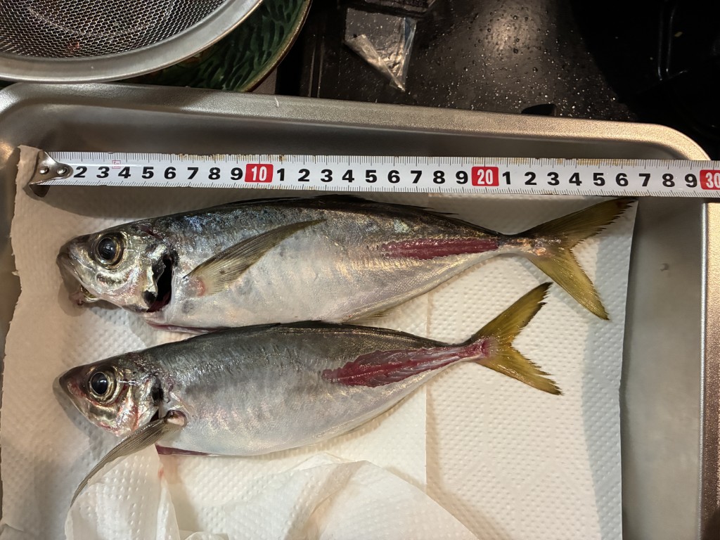 準備が終わりキャストしていくと、さっそく隣のサビキ釣り師のおじさんが大きなアジを釣り上げています。